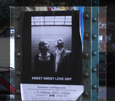 Stell dir vor, du willst an einem ganz normalen Abend mit Freunden was trinken gehen, und du gerätst in ein besonderes Ereignis- mit Kurzfilmen, Livemusik, Tanz, Theater; du bewegst dich völlig frei durch 3 Räume eines Hauses, siehst dir ganz unterschiedliche Dinge an, eine Band, Tangos, Clowns, die Geschichte einer Hure, du stellst dir deinen Abend wie ein Puzzle selbstzusammen, kannst trinken, feiern, tanzen, nach Belieben Kunst in kleinen Portionen erleben, und das Ganze im Rahmen einer großen Party. 20 Künstler verschiedenster Genres schmeißen zusammen einen Abend, eine Nacht, ein Fest. Komm doch einfach vorbei und feier mit! SWEET SWEET LOVE 2007 an 11.Oktober ab 20 Uhr im Haus 73 - nach einer Idee von Angnes Raeck, Musikerin und Performerin, Annette Pullen, Regisseurin und Elmar Eisen, Filmemacher. Mit dabei: Acadian Post, Simon Brusis, Die2Clowns, Jörg Kleemann, Andreas Köhler, Sabine Osthoff, Melanie Strauch, Angnes y Florian ? u.a.